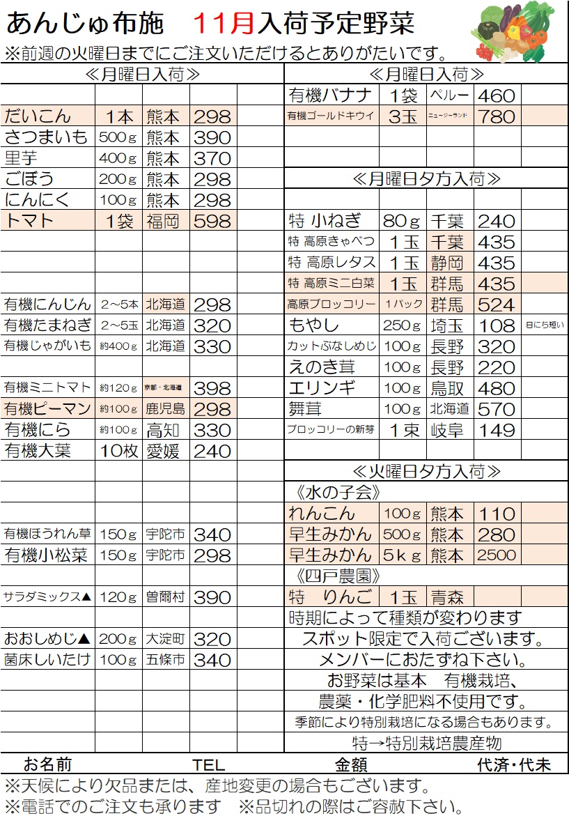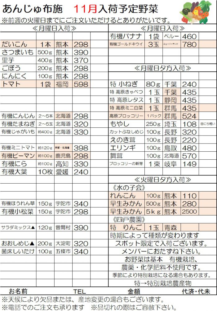 2025お野菜入荷表 11月