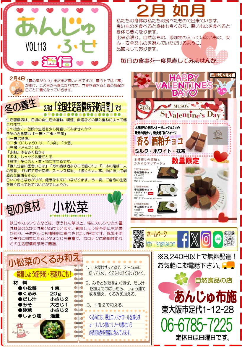 東大阪市布施で有機野菜や無添加商品を取り扱っている、自然食品の店 あんじゅ布施 > お店の情報 > 今月のあんじゅ通信 > 2026あんじゅ通信 2月