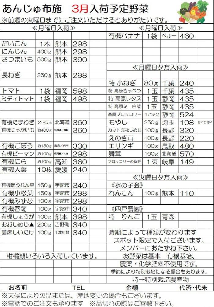 2026お野菜入荷表 3月