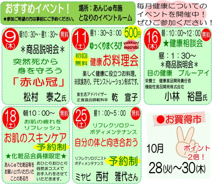 イベント情報 毎月最終週の火・水・木は「お買得市」 10月は 28日(火)・29日(水)・30日(木)の3日間 お買得品がたくさん ぜひおこしください(^▽^)/ ***************************************** *****************************************