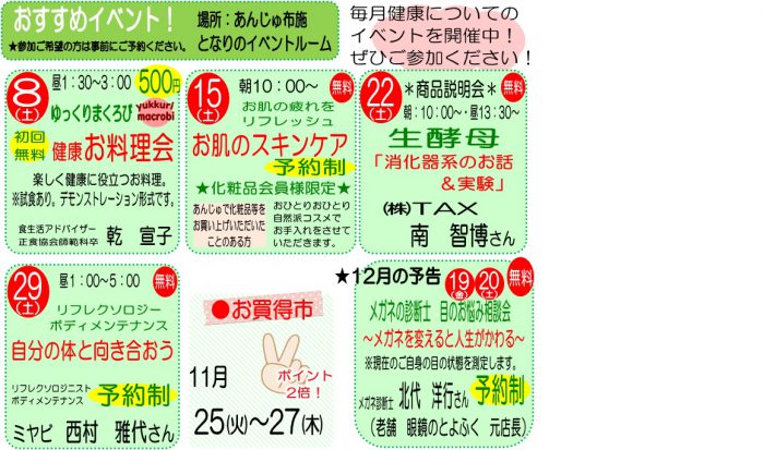 イベント情報 毎月最終週の火・水・木は「お買得市」 11月は 25日(火)・26日(水)・27日(木)の3日間 お買得品がたくさん ぜひおこしください(^▽^)/ ***************************************** *****************************************