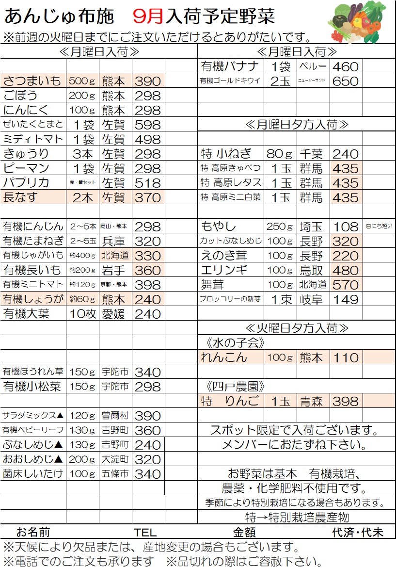 東大阪市布施で有機野菜や無添加商品を取り扱っている、自然食品の店 あんじゅ布施 > お店の情報 > 今月のお野菜入荷表 > 2025お野菜入荷 9月